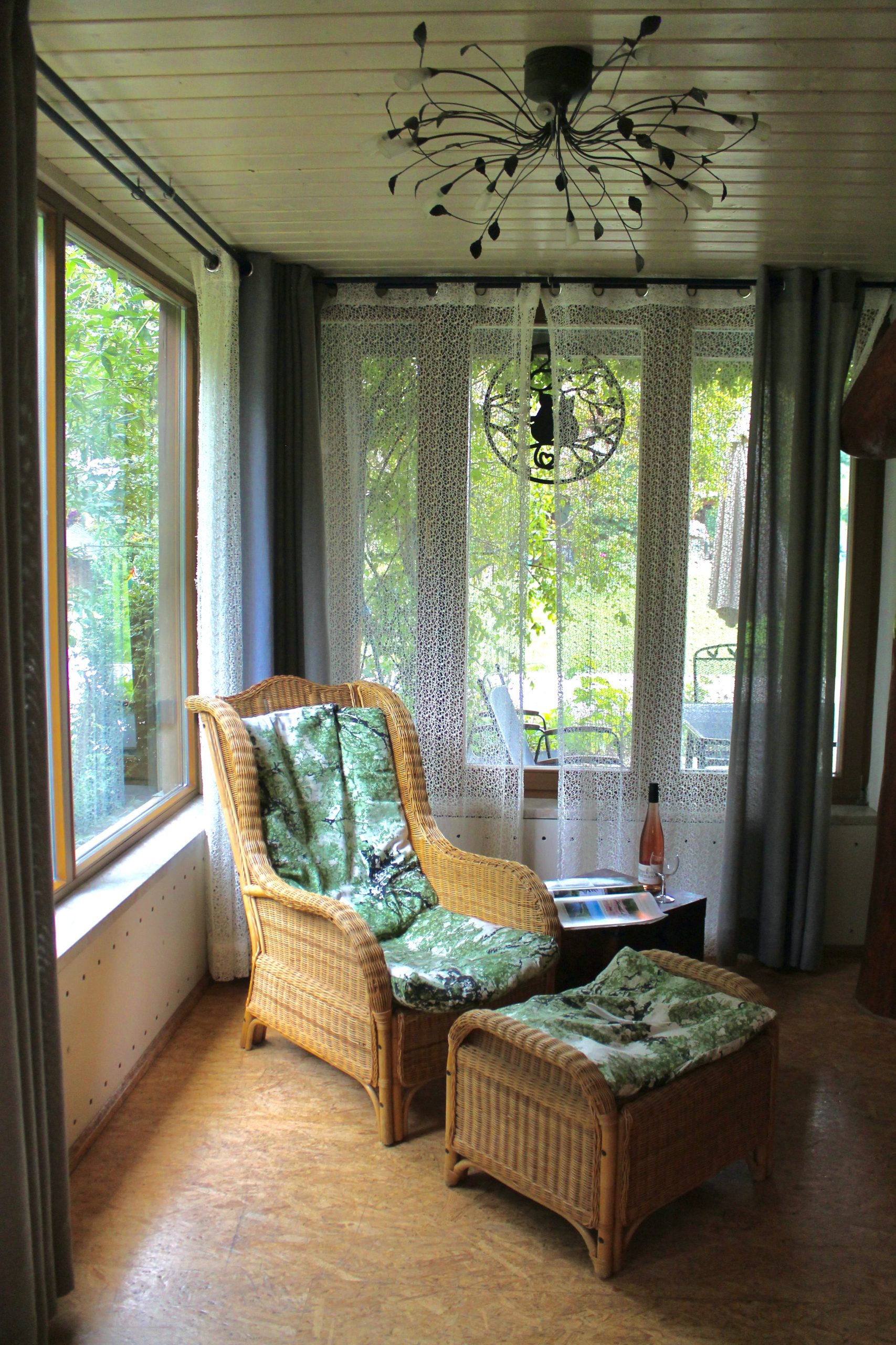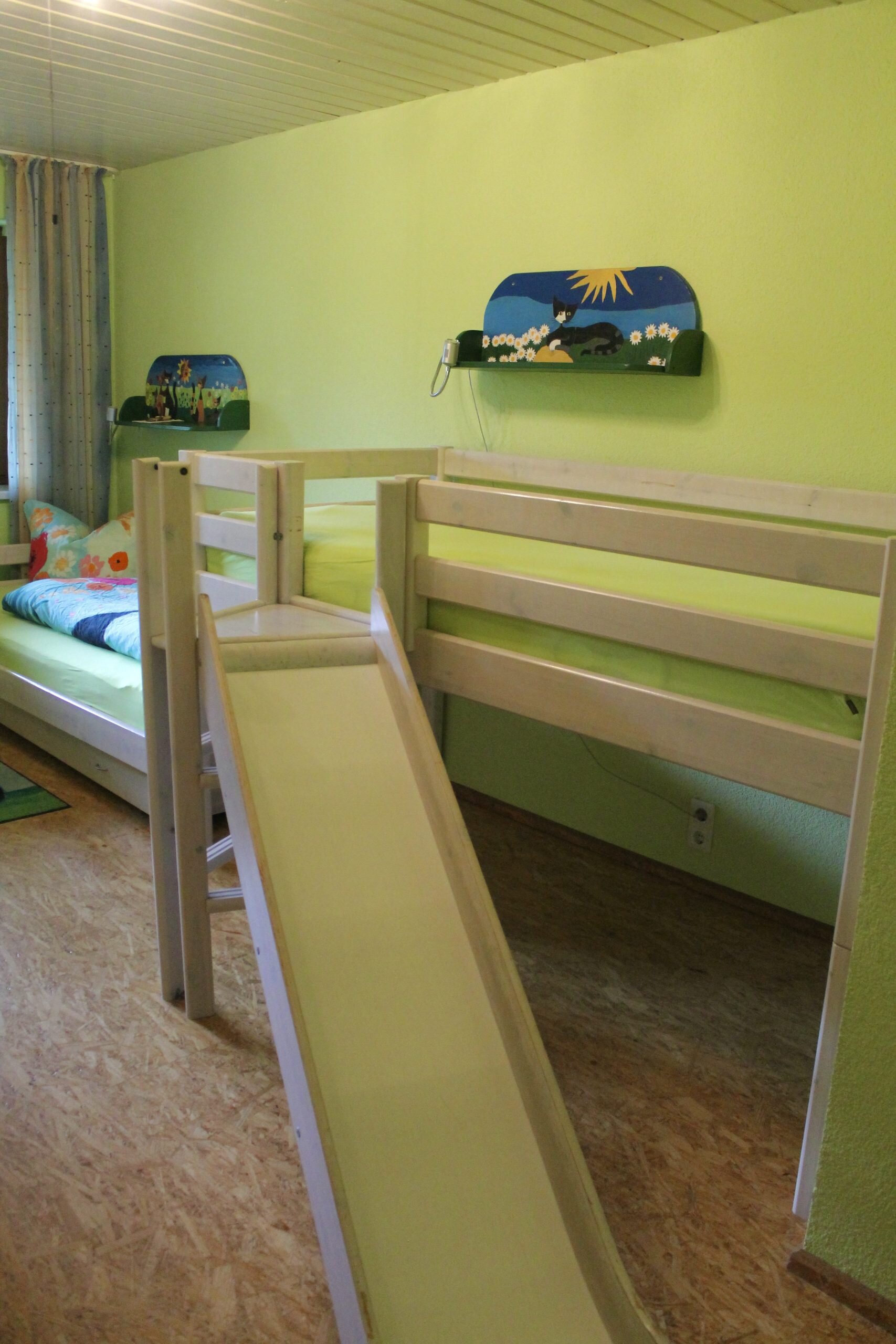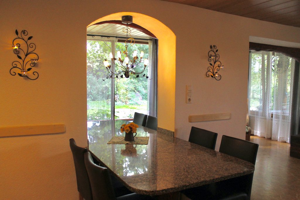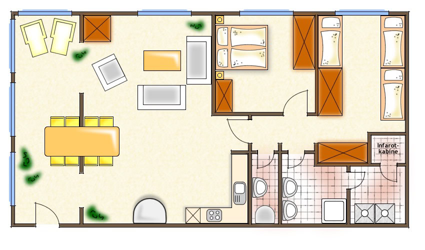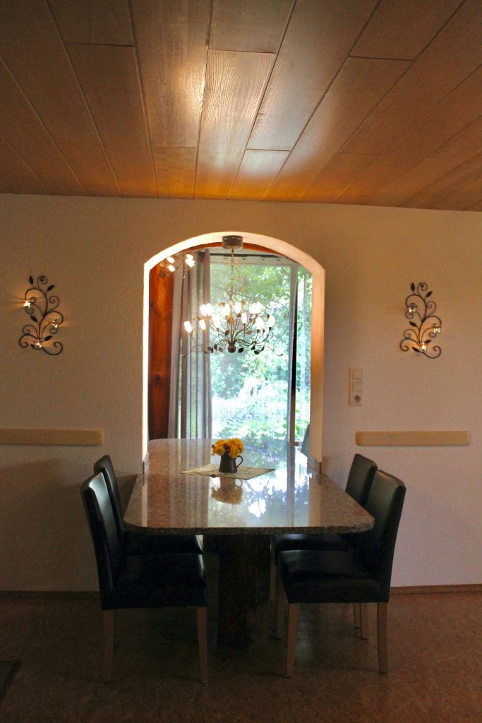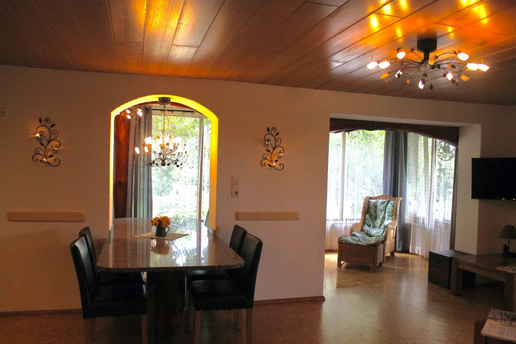 Die Wohnung liegt im Erdgeschoss und hat einen hellen, gemütlichen Wohnraum mit Kaminofen. Der Tisch bietet die Möglichkeit im Wohnraum oder Wintergarten zu essen. Die Terasse bietet viel Platz für Liegestühle und Tischgarnitur (Richtung: Süd-West). Ein Schlafzimmer und Kinderzimmer mit Hochbett stehen zur Verfügung.